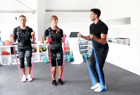 Die Funktionsweise unseres revolutionären Konzeptes ist einfach: Während des Trainings trägt der Kunde spezielle EMS-Funktionswesten, die mit einem EMS-Gerät verbunden sind. Das Gerät sendet elektrische Impulse an die Muskulatur, die intensives Muskeltraining auslösen. Die Kontraktionen der Muskeln sind dabei deutlich intensiver als bei herkömmlichem Training, da zusätzlich zur aktiven Bewegung auch die Muskulatur durch die elektrischen Impulse stimuliert wird.